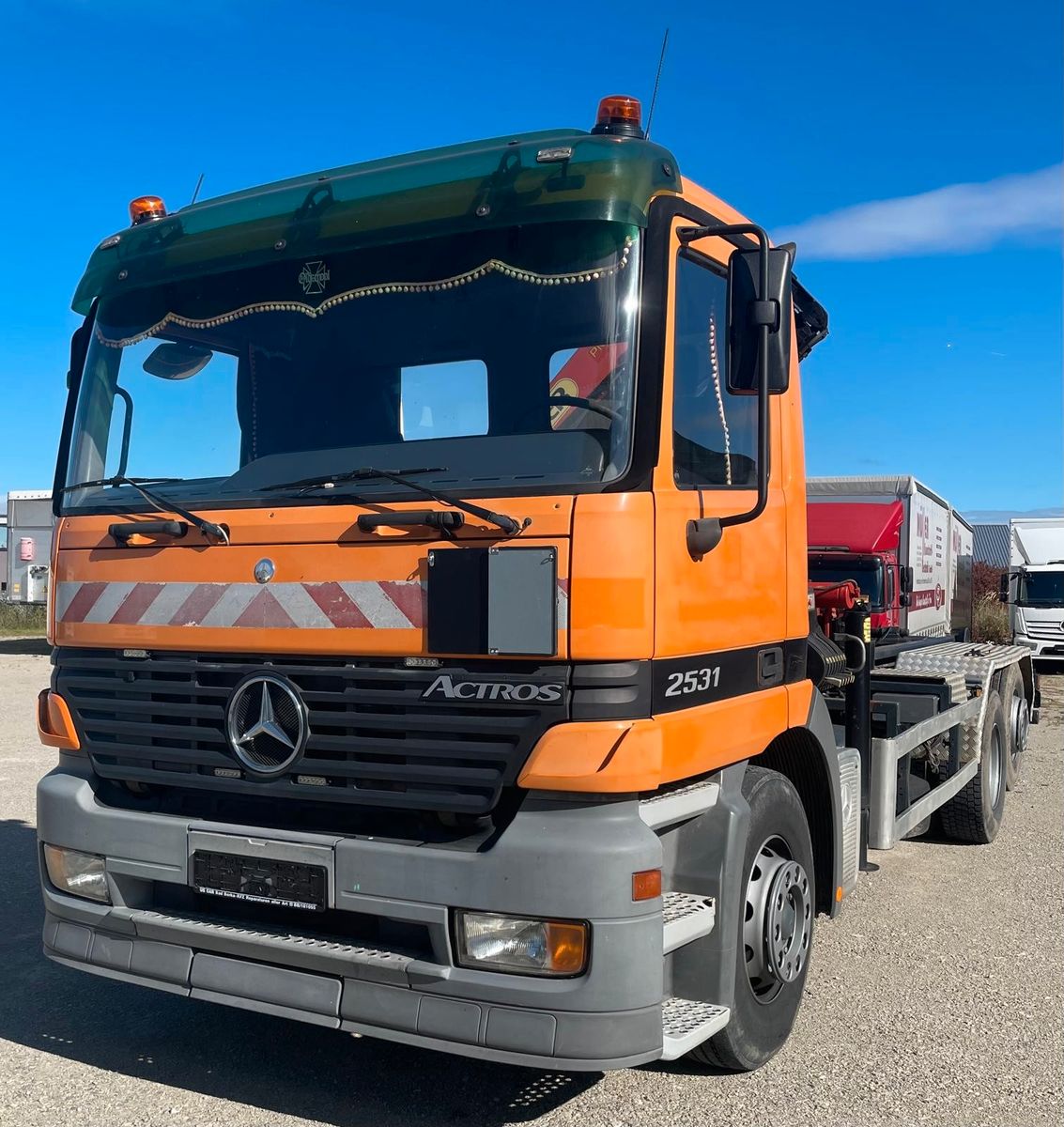 Zum Verkauf kommt ein Mercedes Actros 2531 mit einem Abroller Aufbau von Gergen und einem Kran von Palfinger.