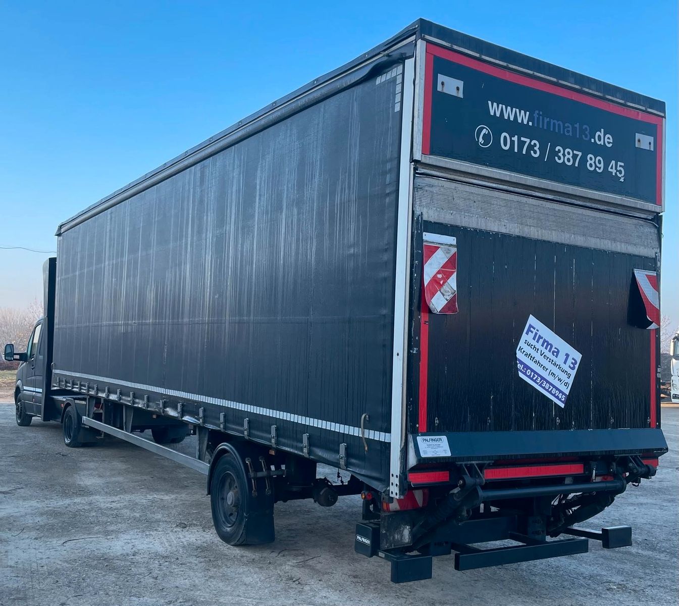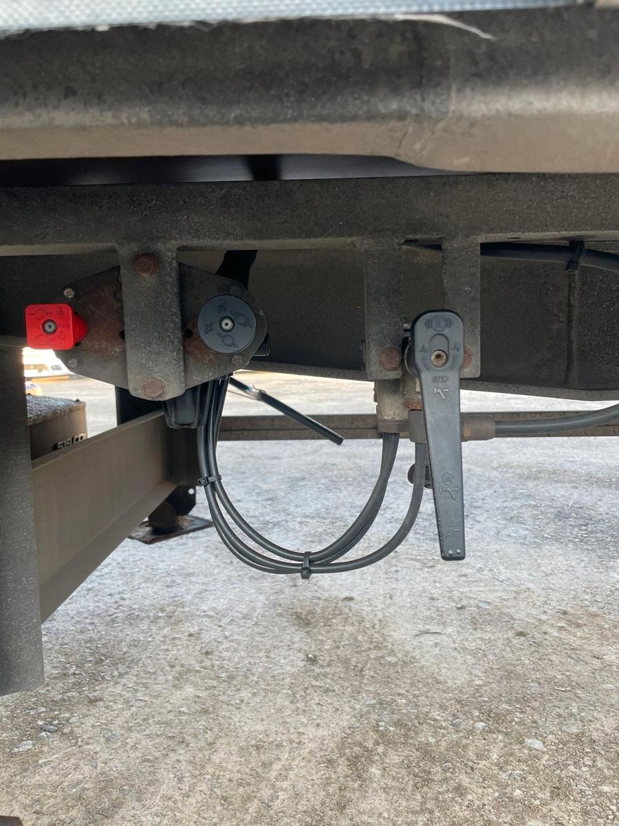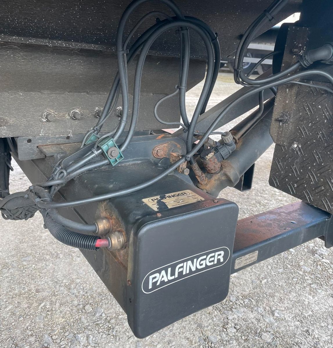 Am Auflieger befindet sich eine Ladebordwand von Palfinger mit 1000 kg Nutzlast inklusive Funkfernbedienung, eine Unterbaukiste und Arbeitsscheinwerfer.